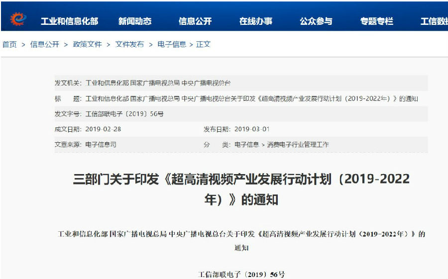 3月1日,由工业和信息化部、国家广播电视总局、中央广播电视总台联合制定的《超高清视频产业发展行动计划(2019-2022年)》正式发布!