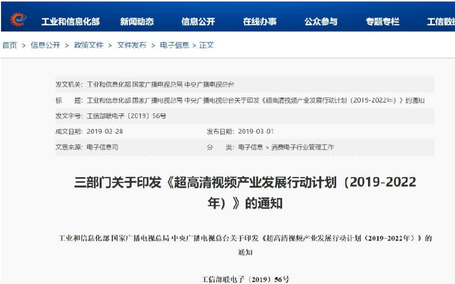 《超高清视频产业发展行动计划(2019-2022年)》正式发布